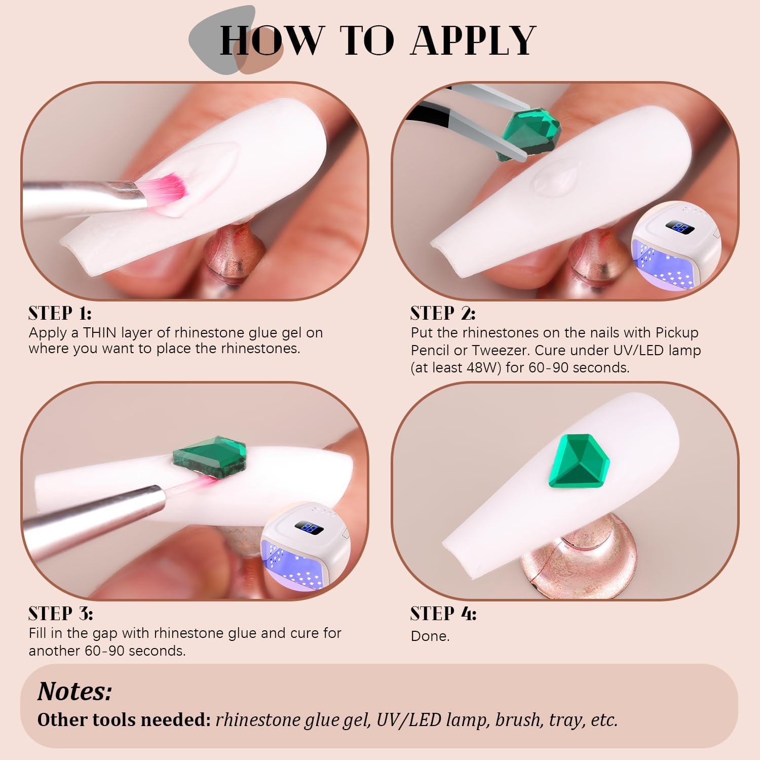 - 💎EASY TO USE -- Easy to apply on artificial nails. After applying nail polish and applying enough gel on the nails, simply use the equipped tools (pickup pen + tweezers) to pick up the crystals onto your nails to create your fabulous DIY designs! These crystals gemstones are different from those hotfix stones, they are not self-adhesive, you have to apply glue to stick them (glue is not included.)