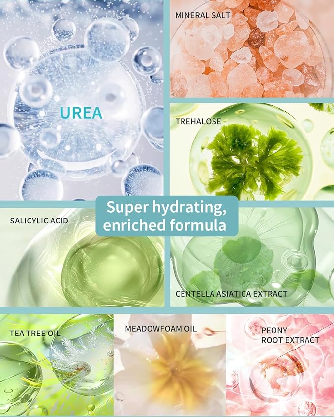 - Deep Cleansing, Soothing & Repairing: The natural mineral salt scrub with urea is used with a blend of essential oils enriched with tea tree oil to quickly soften calluses and rough skin, helping to gently exfoliate and remove dead skin while hydrating and providing essential nutrients to dry skin. After scrubbing, apply a few drops of the serum evenly to soothe and deeply moisturize cracked skin. Leaves our hands and feet feeling soft, smooth, comfortable and clean.