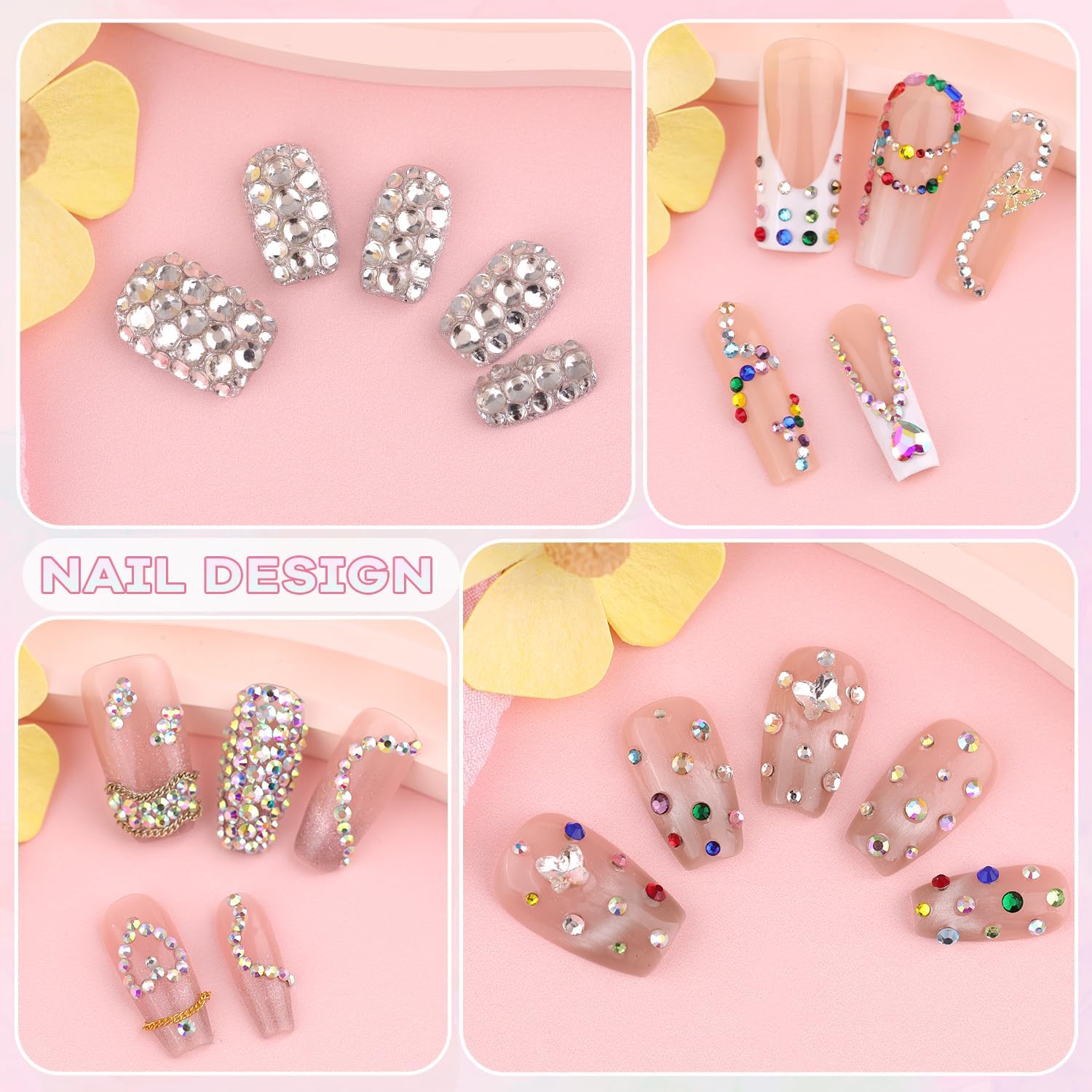 - Package Content -- One package includes approx. 4200 pcs (1.2/1.5/2/2.3 mm) Multicolors mini nail gems and approx. 1200 pcs (1.5/2/3 mm) clear AB nail rhinestones, 1 tweezers, 1 pick-up pencil. The nail kit with sufficient tools can easily meet your nail design needs at home