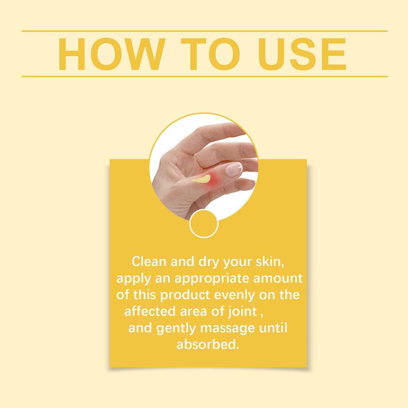- How To Use:First wash and dry the area you want to apply with clean water, then gently apply to the joints and massage for 1-2 minutes until it is fully absorbed